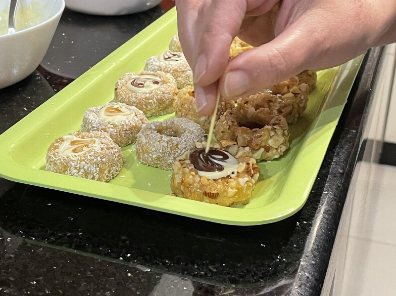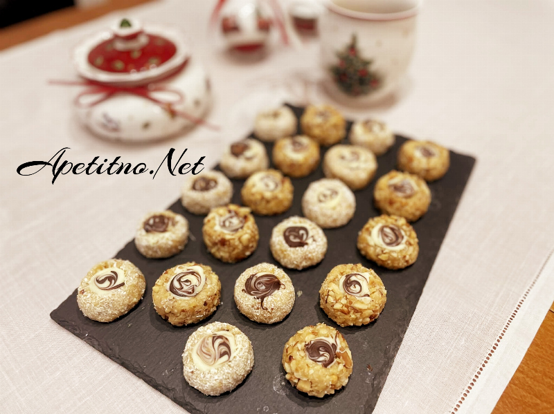 Масло, мляко и захар се затоплят на котлона, докато захарта се разтопи. Прибавят се 100 гр начупен бял шоколад и ванилия, а когато изстине - смлените бисквити и ядки. Сместа се оставя да изстине, оформят се бонбони, овалват се в смлени ядки, или в кокос. Всяко бонбонче се поставя в малък ринг, по средата с помощта на дръжката на дървена лъжица се оформя кладенче. Капват се капчици карамел, залива се със 100 гр разтопен бял шоколад, отгоре се капва черен шоколад и с клечица се смесват.