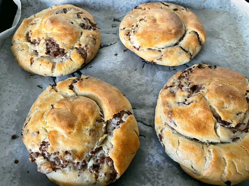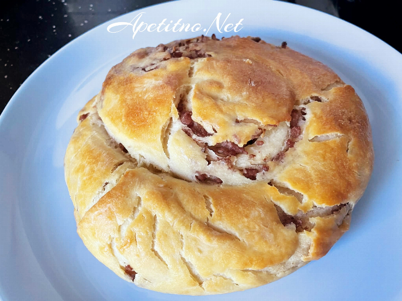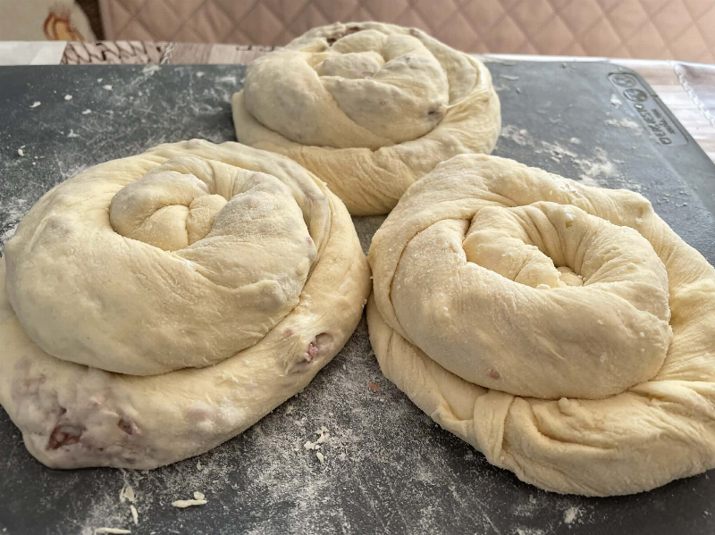 Разтопяват се 120 гр масло и 50 мл олио и с тази смес се намазва всяка кора, поръсва се с настърган кашкавал и натрошено сирене и се навива на руло. Всяко руло се навива на охлювче и се оставят да втасат повторно. Накрая се намазват със смес от жълтък, малко прясно мляко и олио и се печат на 200 градуса около 20-30 минути.