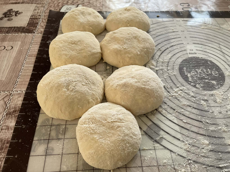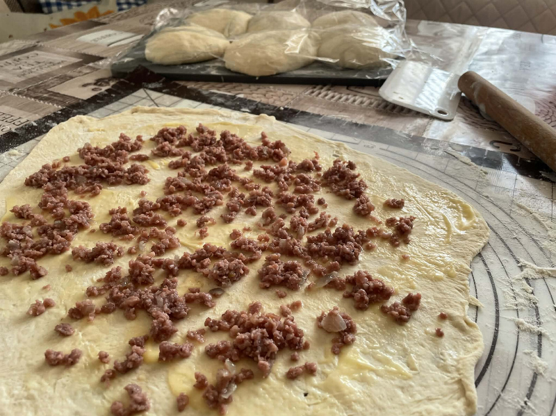 Започва се с течните продукти - в топлите вода и мляко се добавя разтворената мая и по малко от смесените и пресяти сухи продукти, а накрая - и малко олио. Получава се лепкаво и меко тесто, което се оставя за 45 минути да втаса на топло. Тестото се разделя на 7 топчета, които се разточват на тънки кори.