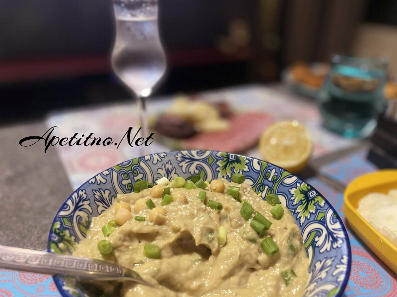 Разядката се сервира поръсена с цели нахутени зрънца, пресен лук и сусам.