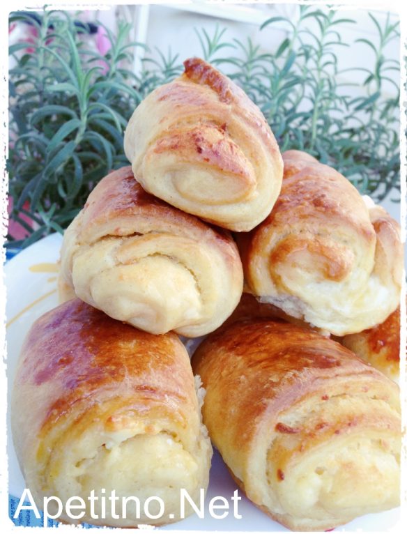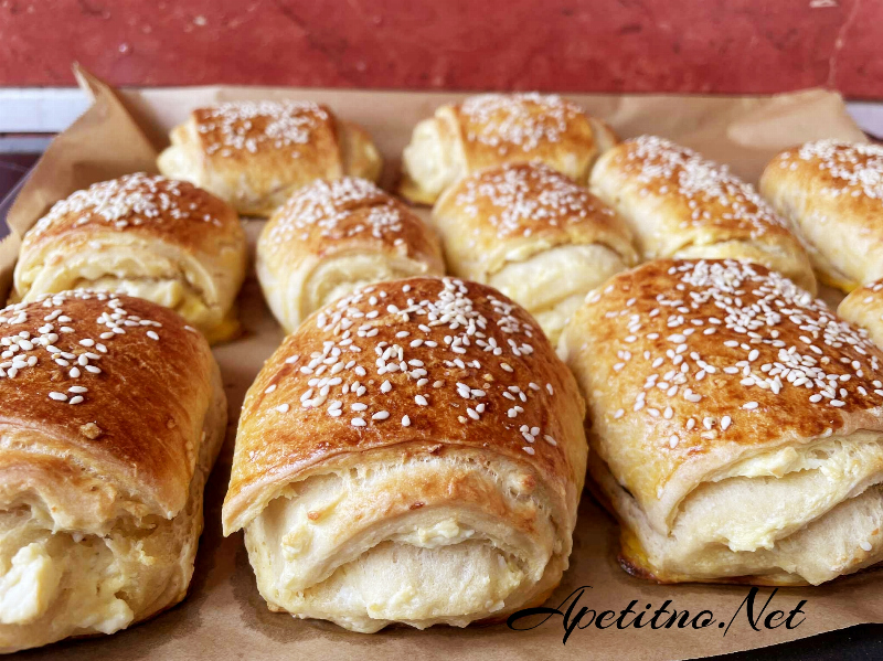 Продуктите се смесват и се меси меко тесто. Разделя се на 4 топчета, от които се разточват 4 кори с дебелина 1/2 см. Сиренето се намачква с вилица, смесва се с яйце и белтък и се намазват корите. Нарязват се на 10 см парчета и се оставят да втасат 45 минути.