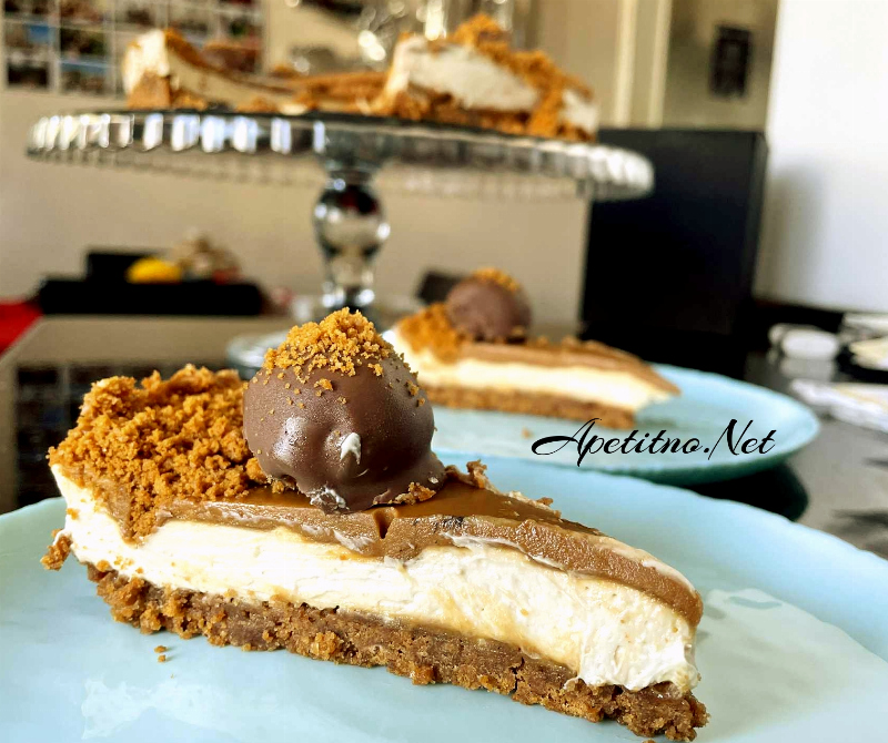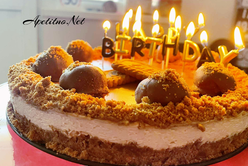 Сметаната се разбива с малко пудра захар, крем сиренето и половината Biscoff крем. Разпределя се върху блата и отново се охлажда за 20 минути. Останалият крем се разтопява и се излива върху тортата.