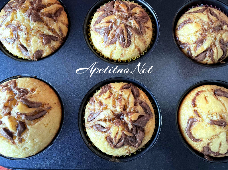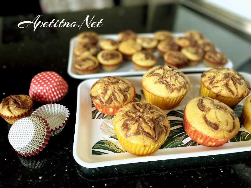 Яйцата се разбиват със захарта, добавя се разтопеното масло. Млякото се редува с брашното, смесено с бакпулвер. Сместа се разпределя до средата на формичките за мъфини. Във всяка се слага по чаена лъжичка леко затоплена Нутела (затопля се, за да е по-течна) и с клечка се завъртат фигурки по повърхността на мъфините.