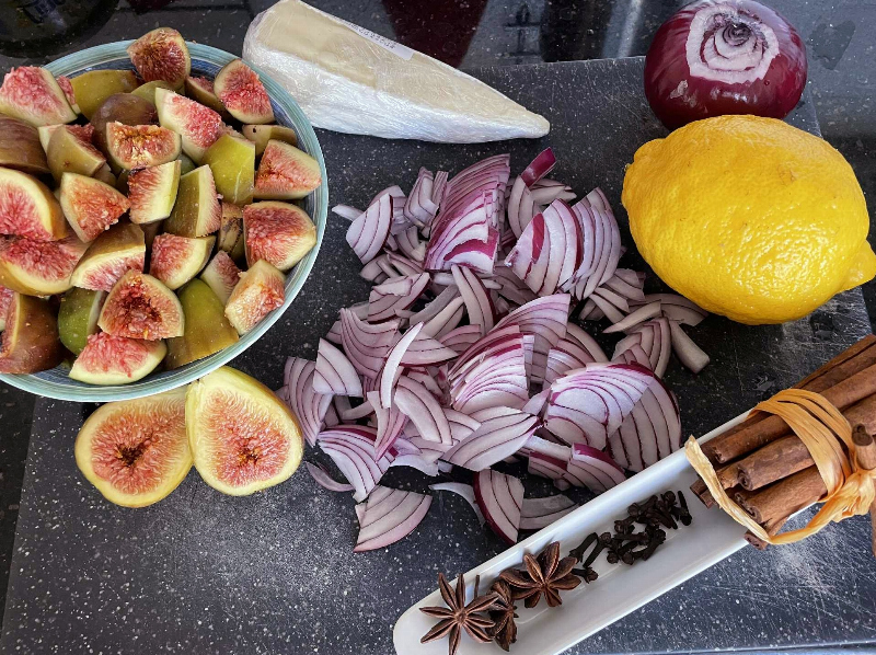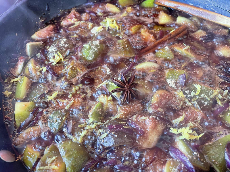 Лукът се нарязва на полумесеци и се карамелизира в малко зехтин и кафява захар. Добавят се нарязаните смокини и всичко ври на умерен огън около 10-15 минути. В хаванче се счукват карамфил, бахар, кориандър и се подправя заедно с пръчка канела и звездичка анасон.